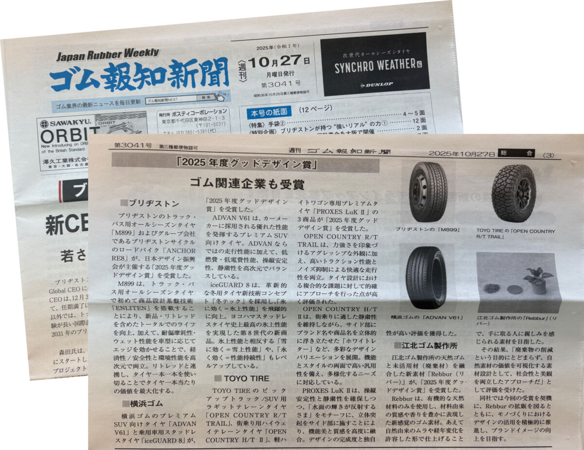 このたび混合に使用した未活用材は、「海苔の端材」「お茶の端材」「卵の殻」の3種類。それぞれ「ノリブラック」 (海苔の端材+天然ゴム)、「ティーグリーン」 (お茶の端材+天然ゴム)、「エッグホワイト」 (卵の殻+天然ゴム)と名付けて製品化も実現しました。